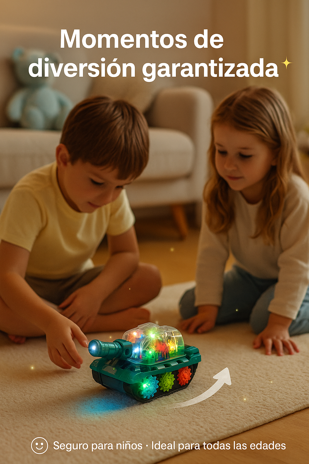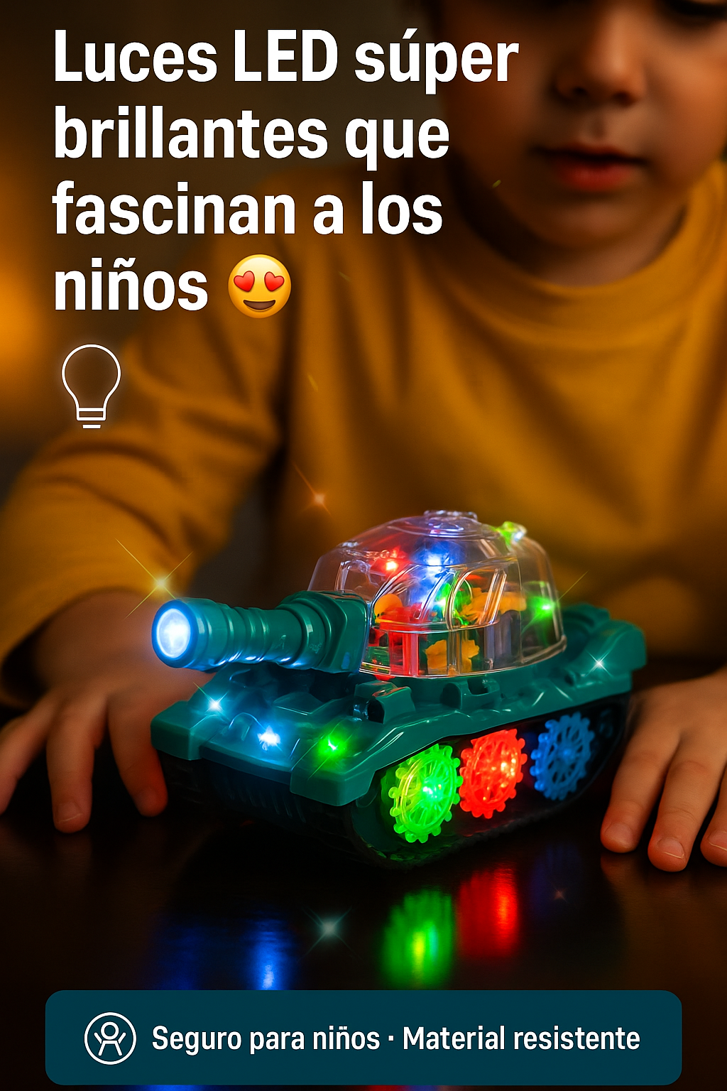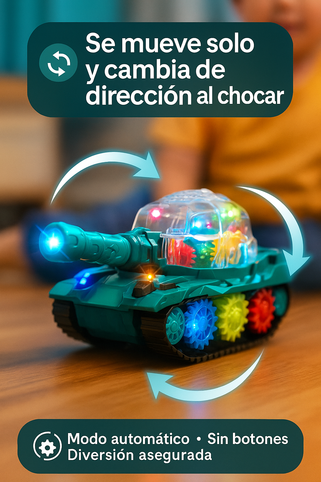 El tanque cambia de dirección al chocar y mantiene un movimiento dinámico constante. Esto evita que el niño pierda interés y mejora su coordinación visual. Ideal para espacios pequeños, medianos o grandes.