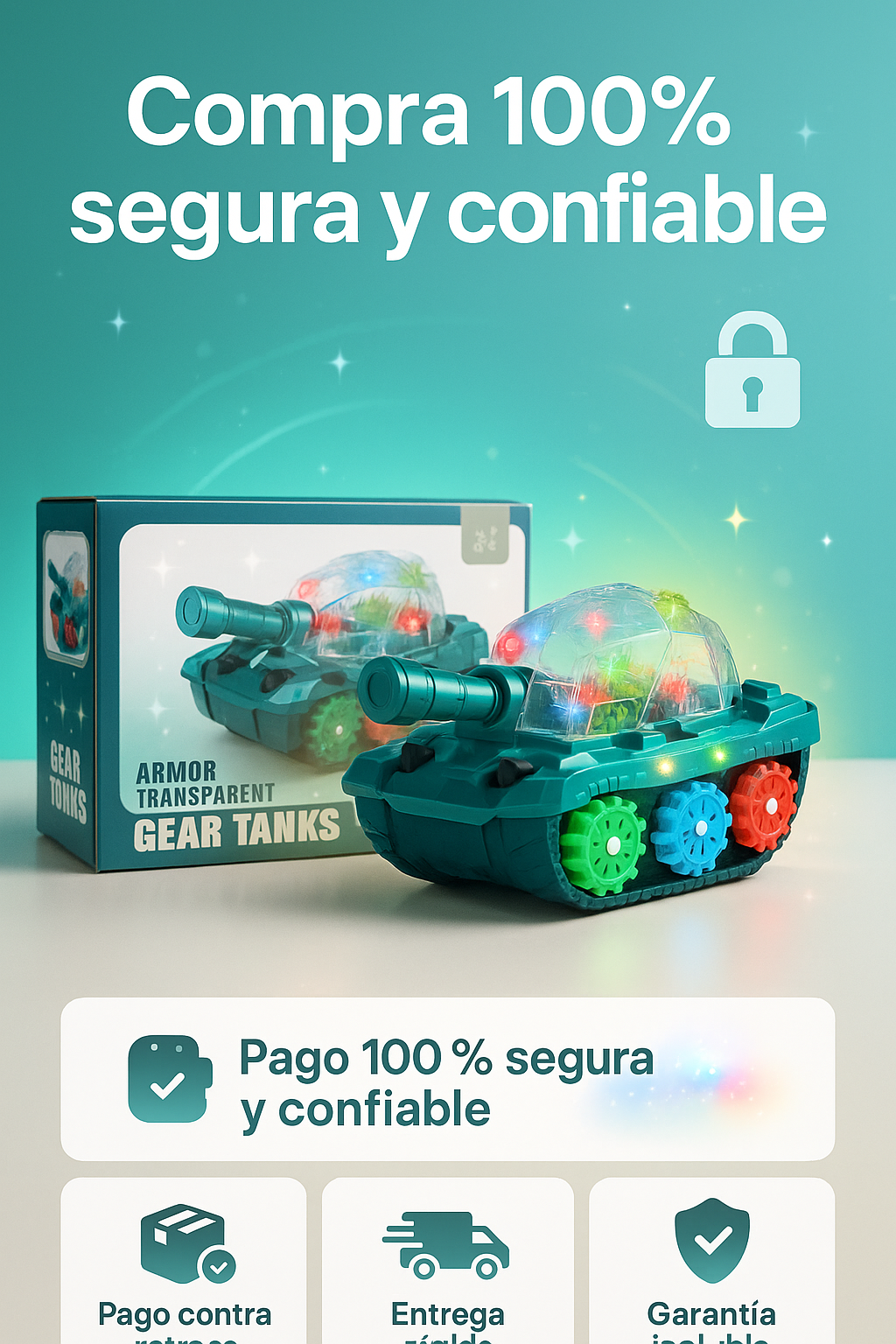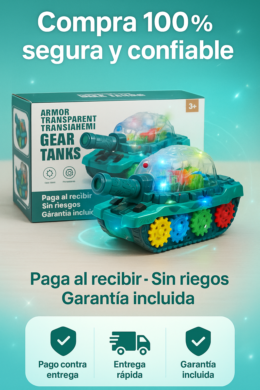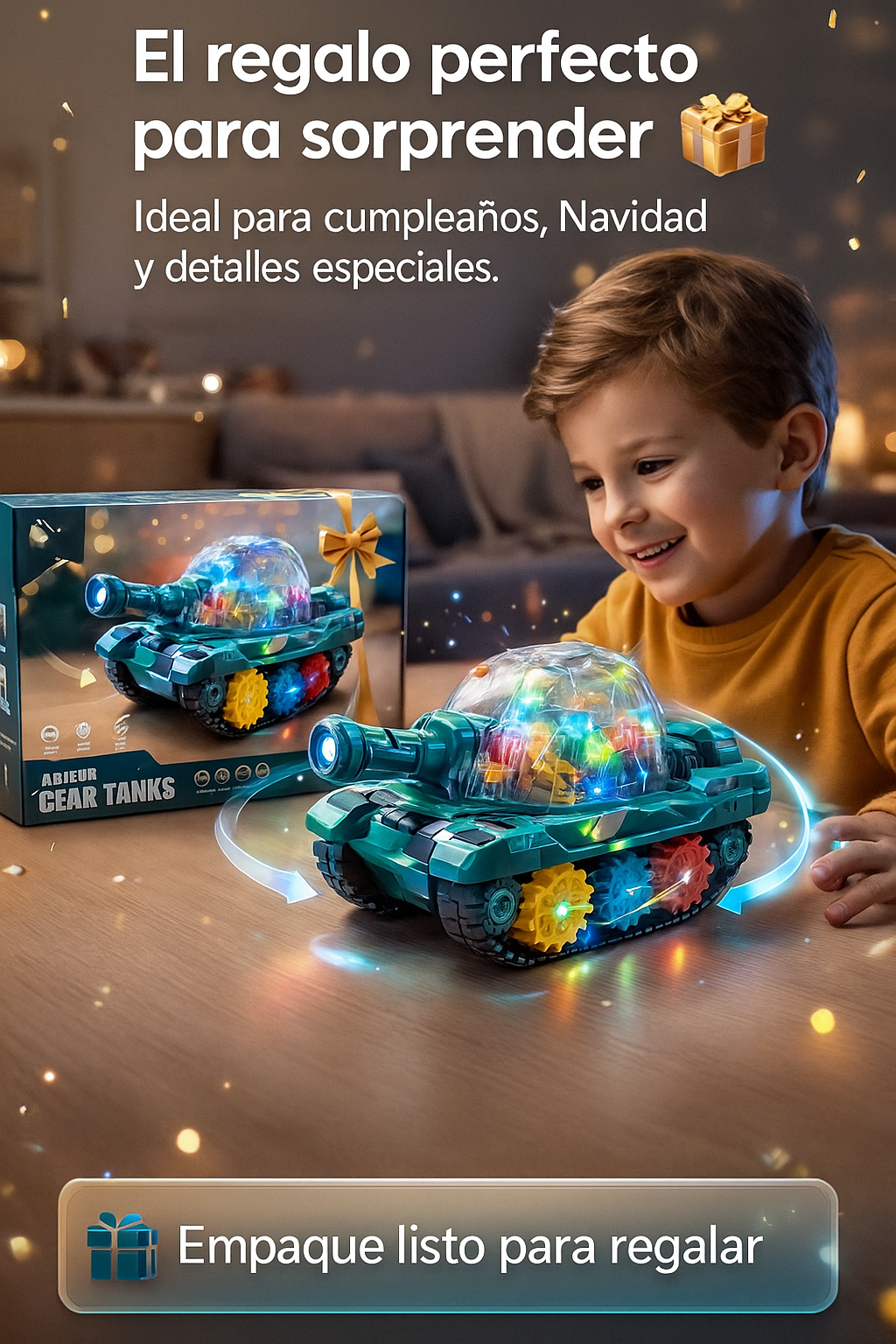 El GearTank LED combina engranajes mecánicos, luces multicolor, sonido dinámico y movimiento automático para generar estimulación sensorial y visual.